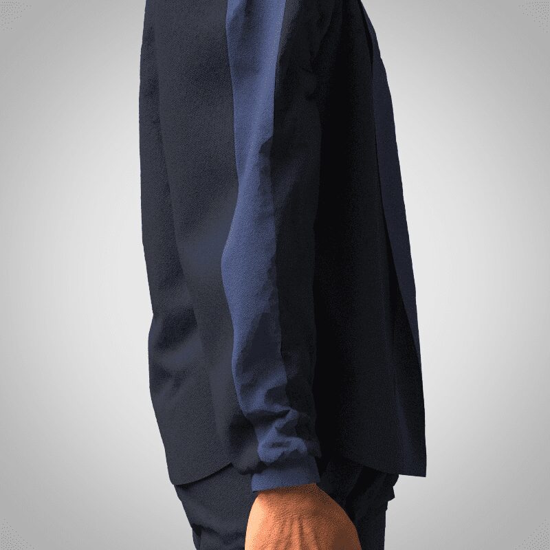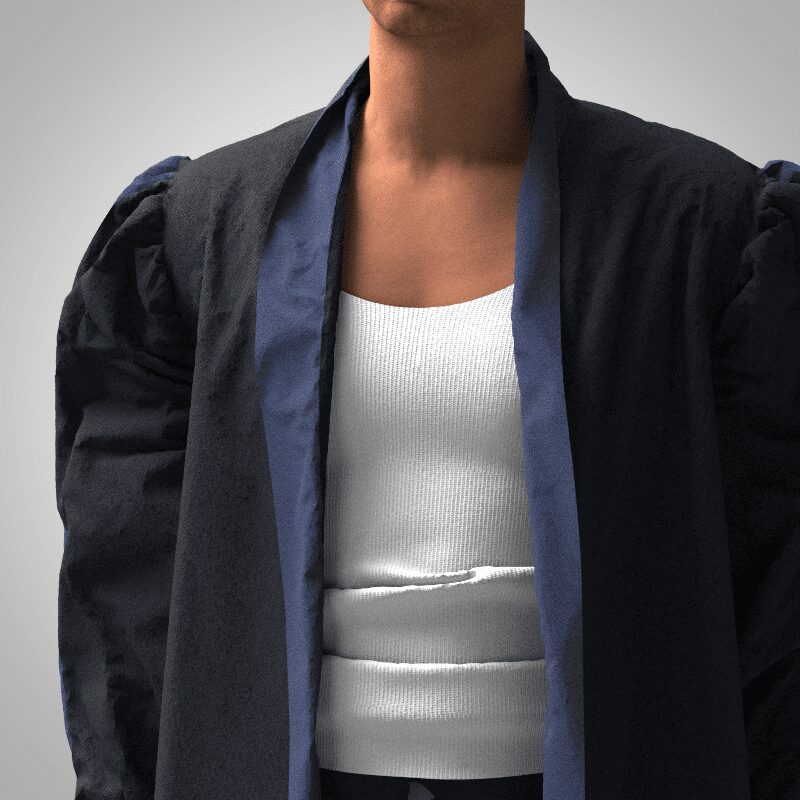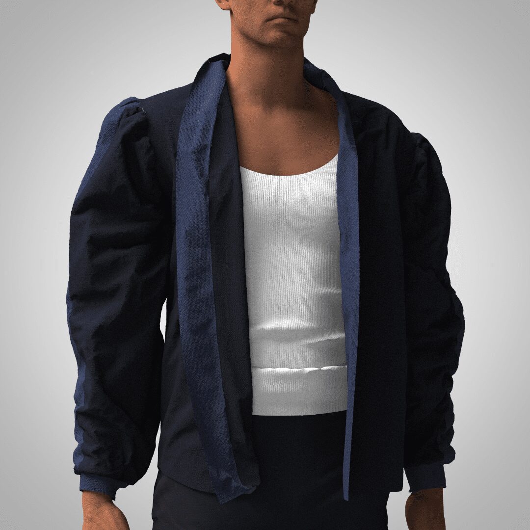This open Black Cotton Poplin Summer Black Bomber Jacket is a comfortable, minimal style with thin panels of blue poplin. The jacket has a wide, puffed sleeve with a gathered thin cuff.