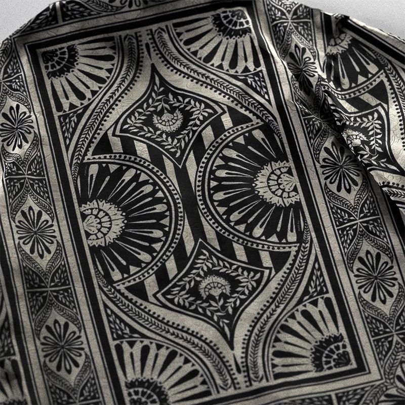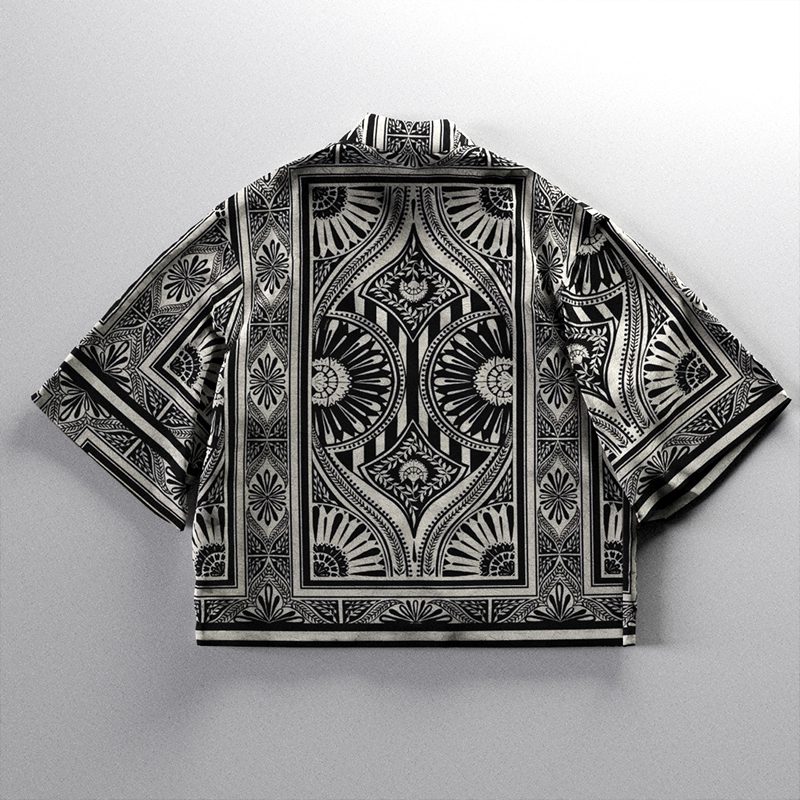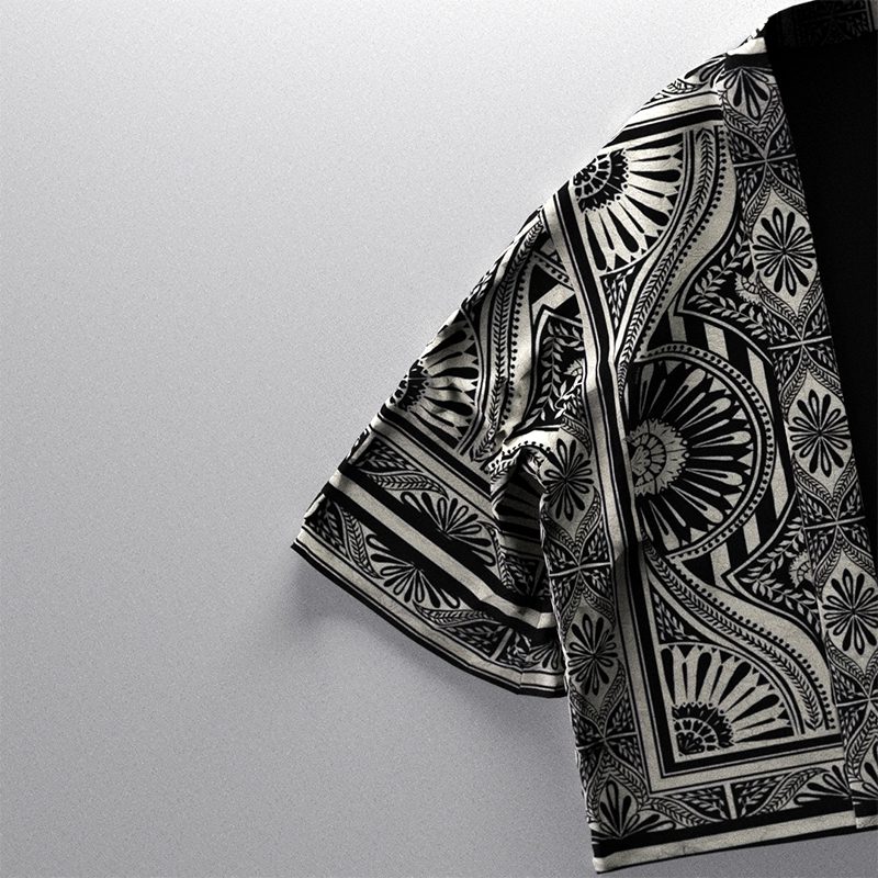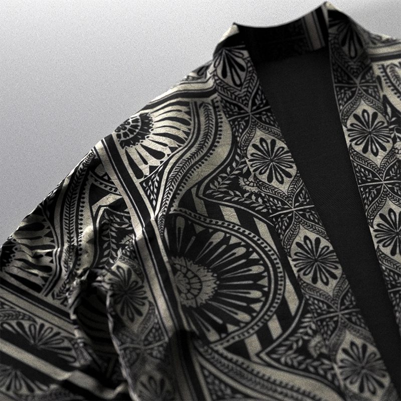 This premium denim kimono robe is custom-printed in a unique monochromatic pattern. The robe has wide kimono sleeves and is shirt length.